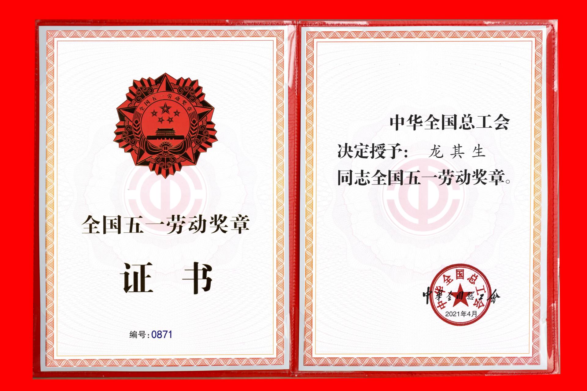 龍其生董事長榮獲2021年全國五一勞動(dòng)獎(jiǎng)證書